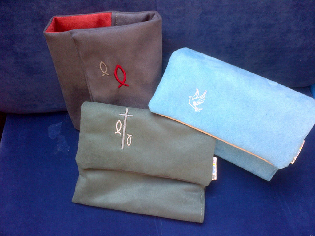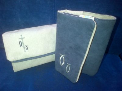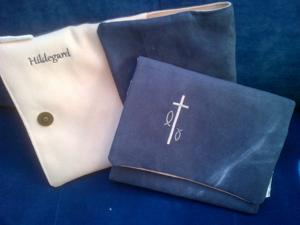 Gotteslob Einband aus robustem Alcantara. Hochwertig bestickt. Mit einem Magnetknopf verschließbar. Auf Wunsch individualisierbar mit Namen gegen Aufpreis.